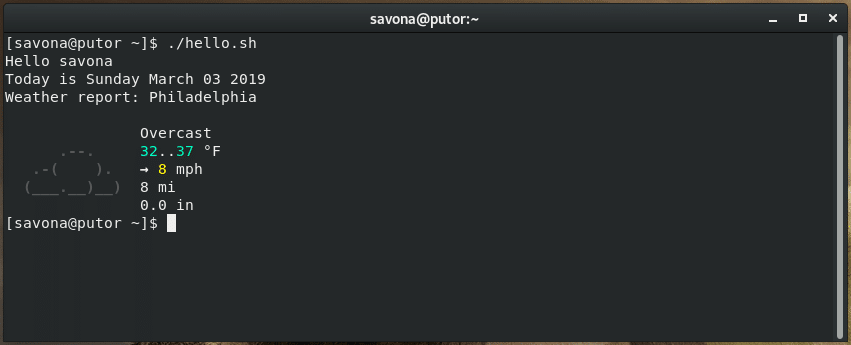 Let’s create a basic script that will say hello, tell us the time and date and give us the weather on the command line.
